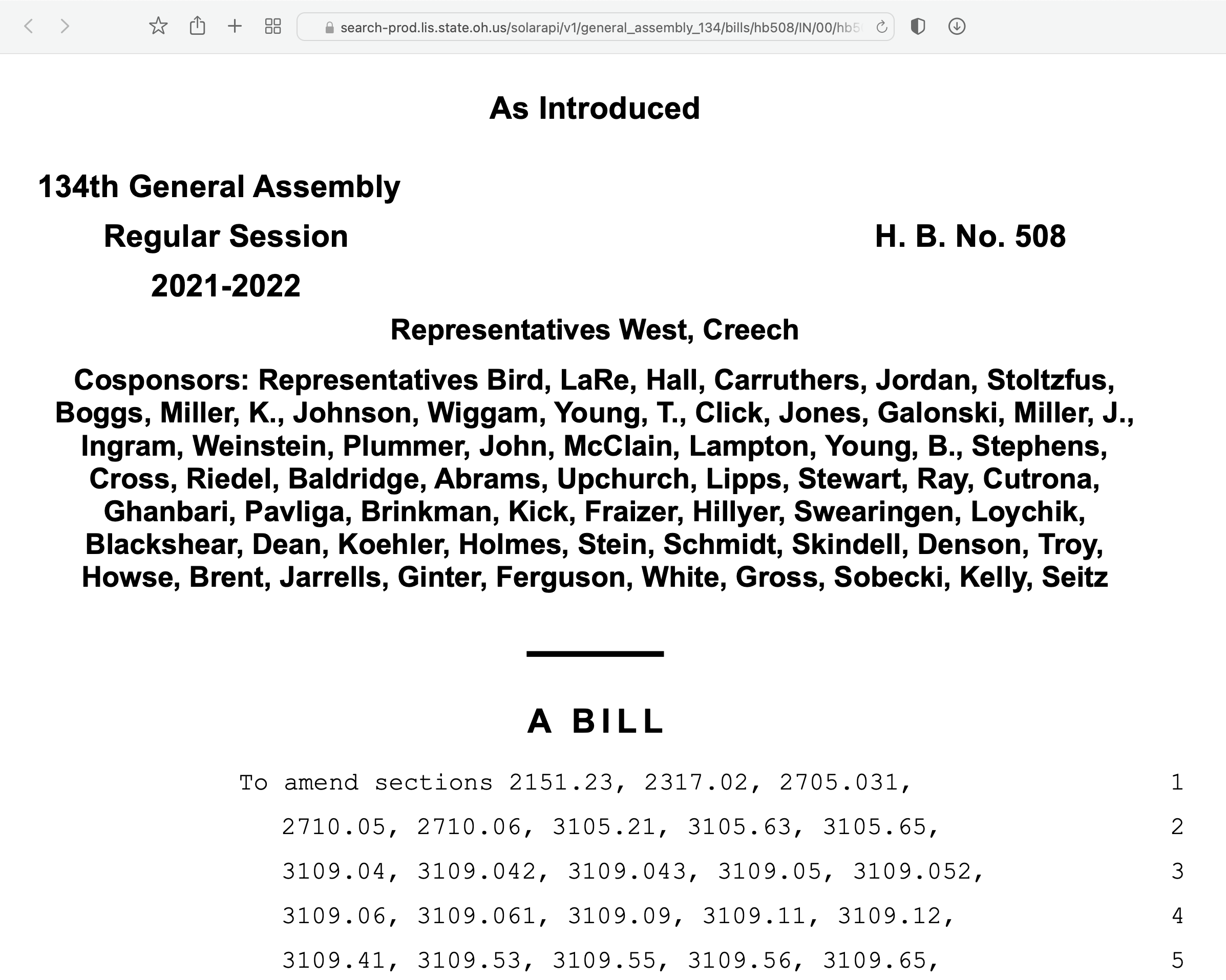 For full text as pdf, Ohio H.B. No. 508 (As Introduced, 134th Gen’l Assembly, 2021-2011)..For my 5/28/22 post, (short-link ends ‘-ez3’).
