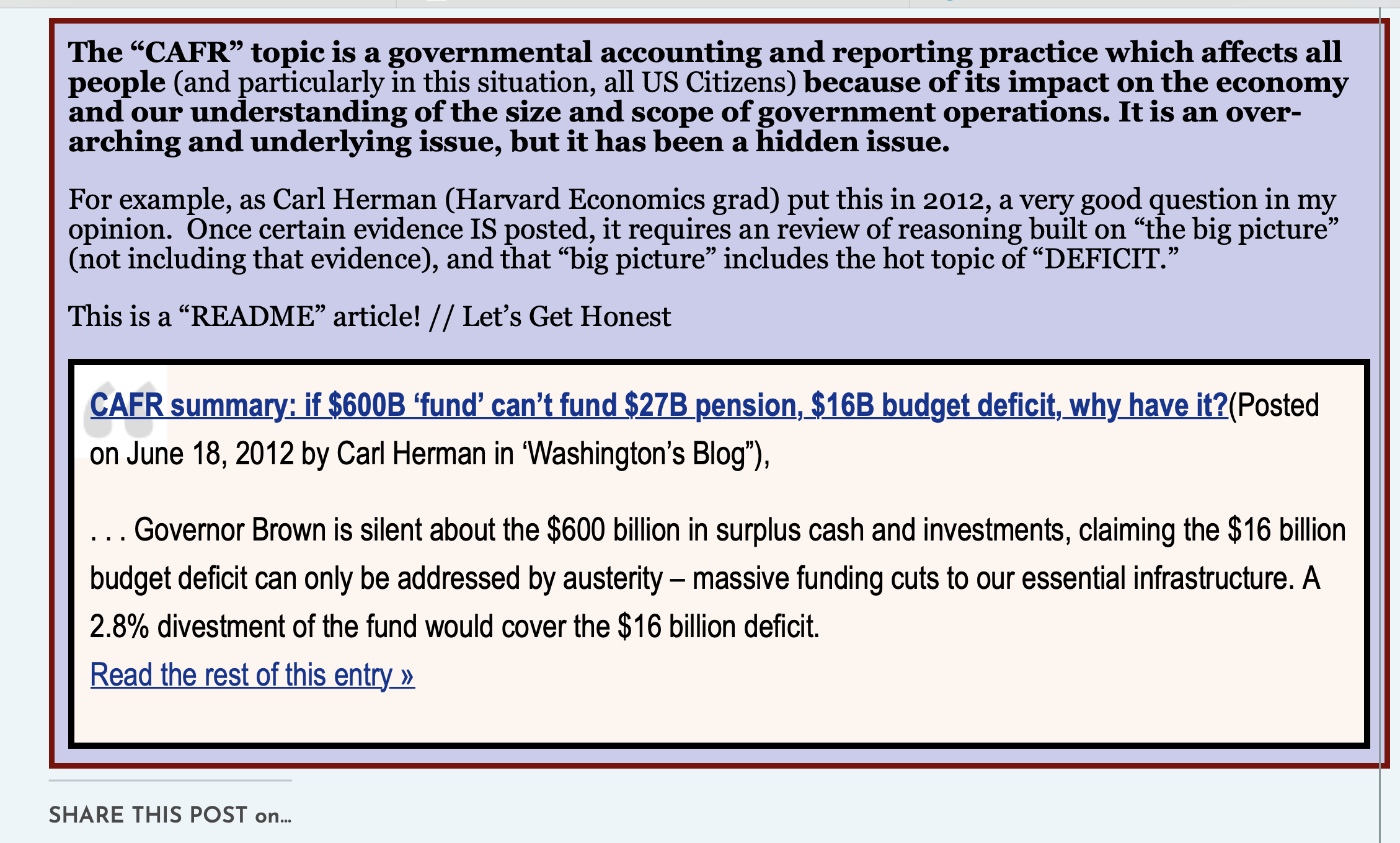 a REALLY early post in this blog (found by searching “CAFR”), questions the logic of California’s giant pension fund. (Walter Burien/Carl Herman). USA (federal) and State Govts stockpiling assets then selling debt and talking “deficit” is nothing new, but talking about this seems to be “heresy” in policyspeak…//LGH 13July,2022