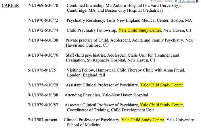 Take a look at Kyle Pruett MD’s c.v. (<–℅ his personal website's main link), how often you see Yale Child Study Center” Besides how often those three words (“Yale Child Study Center”) and some variation of “father” (Fathers, fatherhood, fathering, etc.) feature on his c.v., [2 images, uploaded 11Aug2022]