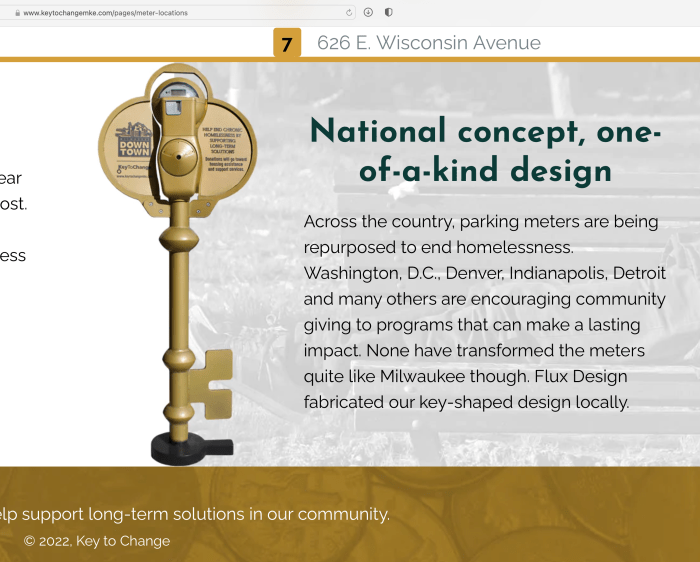 3. Detail of bottom page shows the parking meter has been transformed into a giant Key, with solicitations (from the public) stating what purpose donations are for, but not (on its front at least) to whom they go. It also mentions “Flux Design” as the designer.