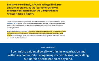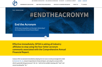 I had noticed the designation (name and with name, acronym) change, but until just now hadn’t understood the rationale for it. Read #EndTheAcronym for yourself– it was racially insenstitive, possibly associated (when pronounced as a word) with a term associated with South African Apartheid, as explained by the GFOA (feel free to look up