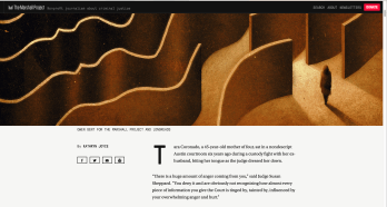 Three large graphics in similar color scheme (full-width) are labeled: “OWEN GENT FOR THE MARSHALL PROJECT AND LONGREADS” and the by-line is Kathryn Joyce, over a small notice: “This article was published in partnership with LongReads.” As often happens (see for yourself…) narrow-ish columns of print are interspersed with solicitations to subscribe to The Marshall Project newsletter and the large (and also tall) graphics / artwork. Few links show in the article.