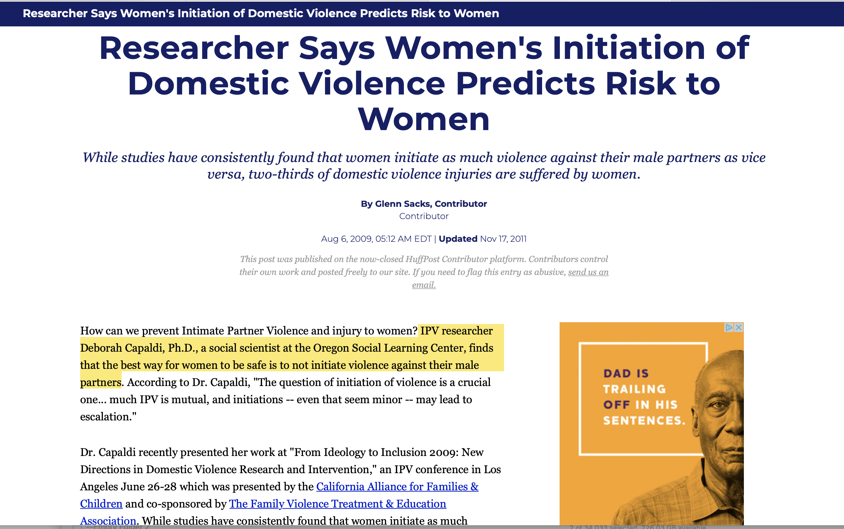 2009 HuffPo article jumped on by Glen Sacks, quoting Deborah Capaldi (mutual violence by women, women-initiated violence gets (us) hurt the worst) (for my post ‘-eD2’, June 2022)