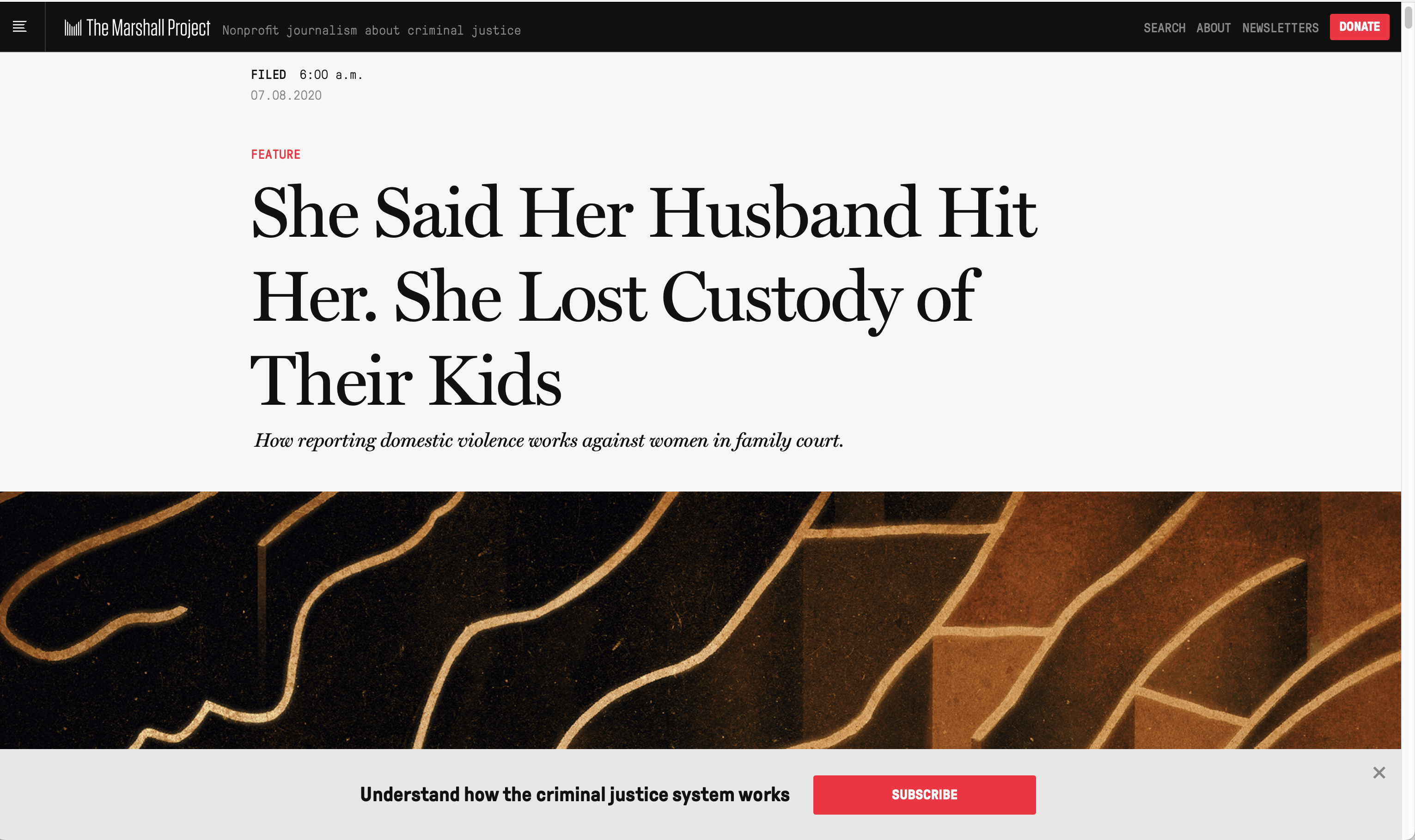 “She Says Her Husband Hit Her: She Lost Custody of Their Kids” publ. July 8, 2020, by The Marshall Project in association with Long Reads [Automattic, Inc. owns] for my July, 2022 post (1) of (7)