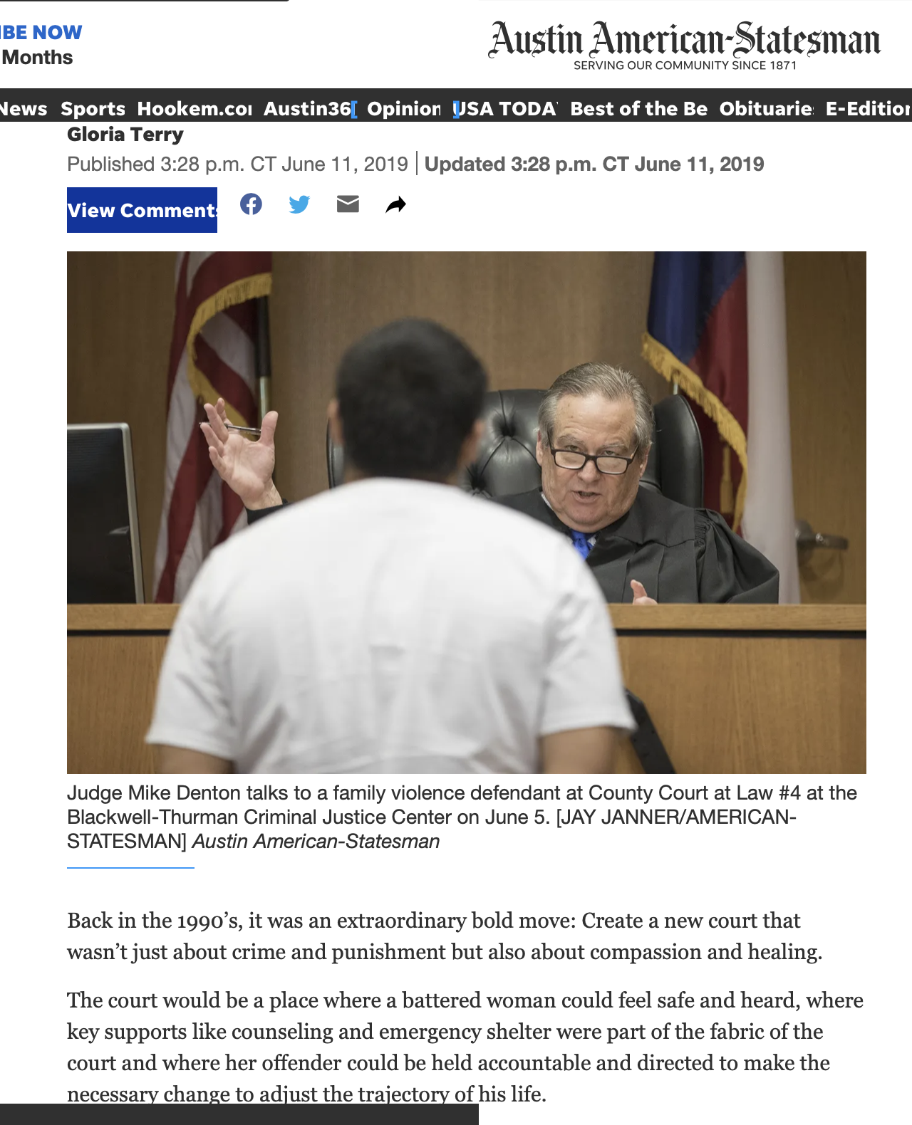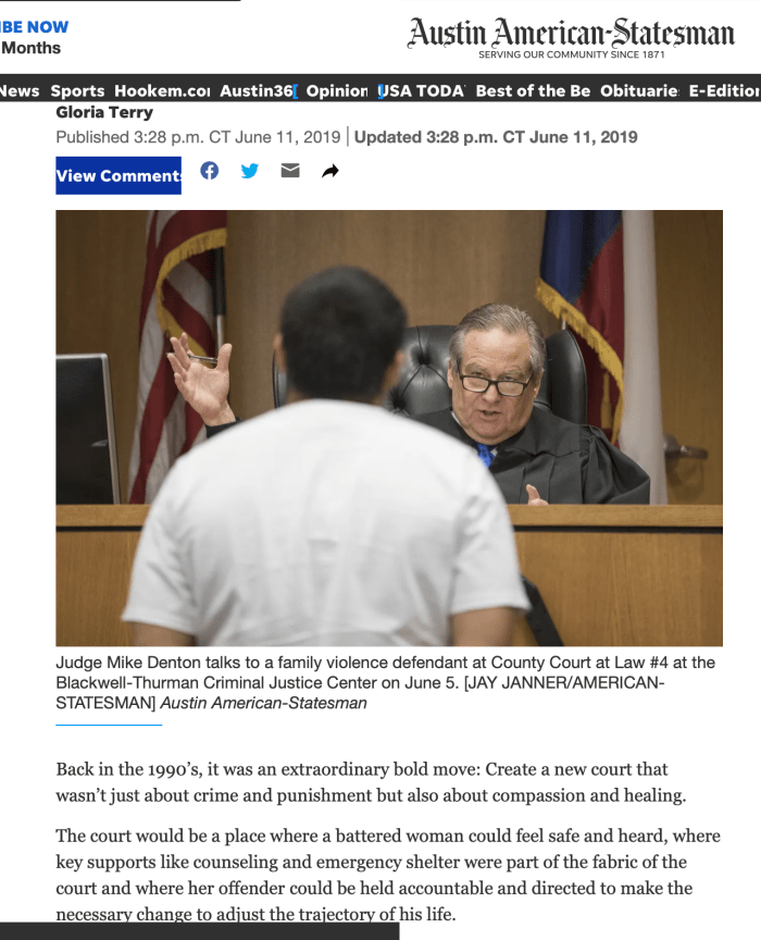 a June, 2019 article in the “Statesman” celebrating the 20th year of a specialty domestic violence court
