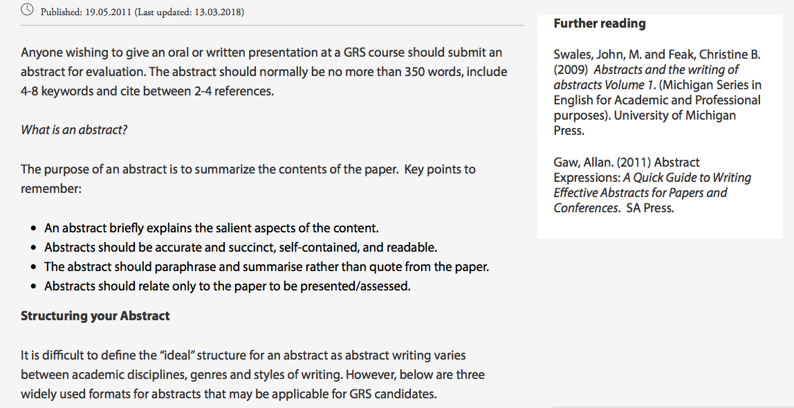 GRS Abstract Guidelines — for grad students wishing to present. “abstract writing varies between academic disciplines, genres, and writing styles.” Also notice the two recommended readings to right (2009, UMichigan; 2011, SA Press/Allan Gaw).