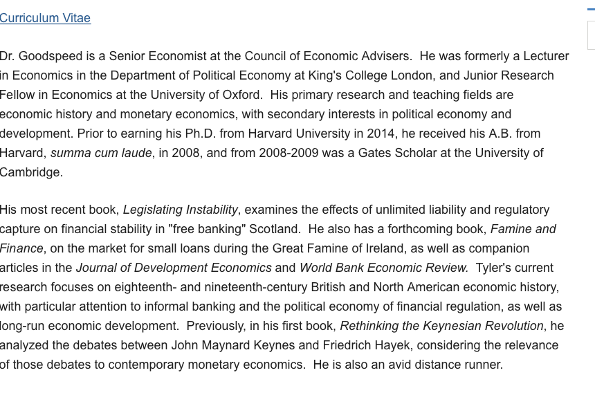 Screenprint #2 of 4, Dr. Tyler Beck Goodspeed, bio (2 images) and 2 images from his C.V. (Senior Economist, Council of Economic ____, Executive Office of the President (I believe, meaning, of the USA, not Harvard)