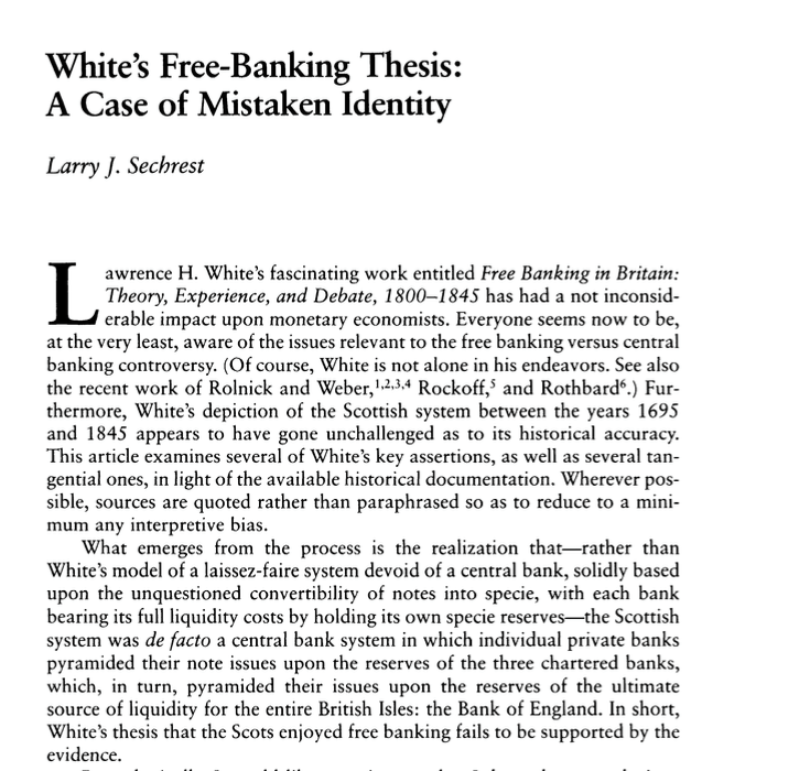 White’s Free-Banking Thesis: A Case of Mistaken Identity, by Larry J Sechrest: || “The author is indebted to Murray N. Rothbard for the suggestion that this line of inquiry might prove productive.