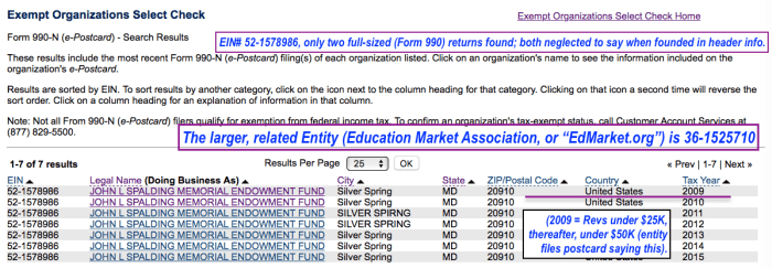 About My Blog Motto (formerly on Vital Info/Sticky Links post, moved here May 26, 2017) » EIN# 52-178986 JLSpalding Mem’l Endowmt Fund (forms 990-N) RELATED ENTITY to EIN#36-1525710 Screen Shot 2017May30 at 5.45PM