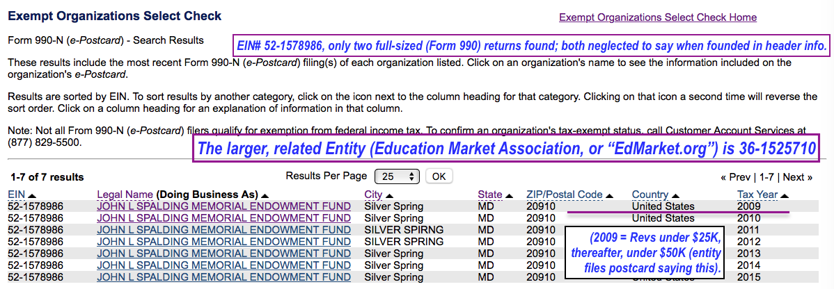 EIN# shown as having filed Forms 990-N (statement of low revenues) 2009 – 2015 from IRS Exempt Org Search website -relates to the current “EdMarket.org (Education Market Association) a 501©6 entity in MD