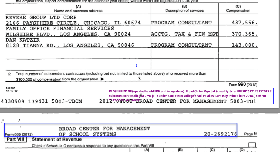 Bank Street College of Education and School (Fast-Tracking FYI on its 100 year Progressive, Experimental Laboratories involving Young Children, History)[published Apr30 2017] » Broad Ctr for Mgmt of School Systms (EIN#202692176 FY2012 3 Subcontractors totaling ca 0’9M [File under Bank Street College:Shael Polakow-Suransky trained here 2008?) ScrShot 2017-04-24