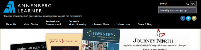 home page of “Annenberg Learning” naturally features the banner links and a moving slideshow (and two sidebars of more info).