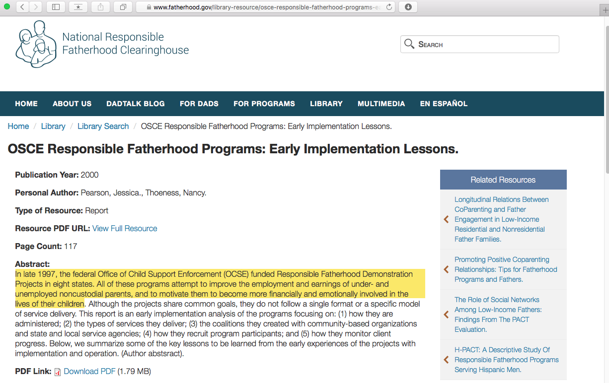 OCSE Resp. Fatherhd Program Early Implementation Lessons (Publ. 2000) as displayed at Fatherhood.gov, featuring some key players in the AFCC, CRC, Child Support and Family Court System.. (8-image gallery added Jan. 13, 2020 to my June, 2017, page on ‘Belated Lessons from Baltimore.” US Citizens who don’t already know: READ! Non-USA concerned individuals, understand what PRWORA has meant to protective mothers, battered women and their children stranded WITHOUT legal assistance in the family courts, while public policy makes this assistance available, gender-based, to their fathers, and rewards states for altering family court case outcomes (which are under state, not federal jurisdiction!”)//LGH