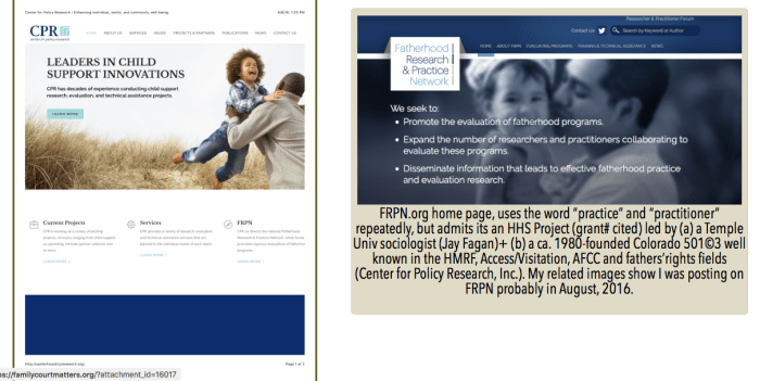 FamilyCourtMatters phrase search FRPN.org ~>LEFT: Image of CPR homepage. RIGHT: FRPN.org website. Image is #1 of 2 from my 3/28/2018 page, in its Footnote AFCC (and the USA) by the Decades| search conducted 4/23/2018
