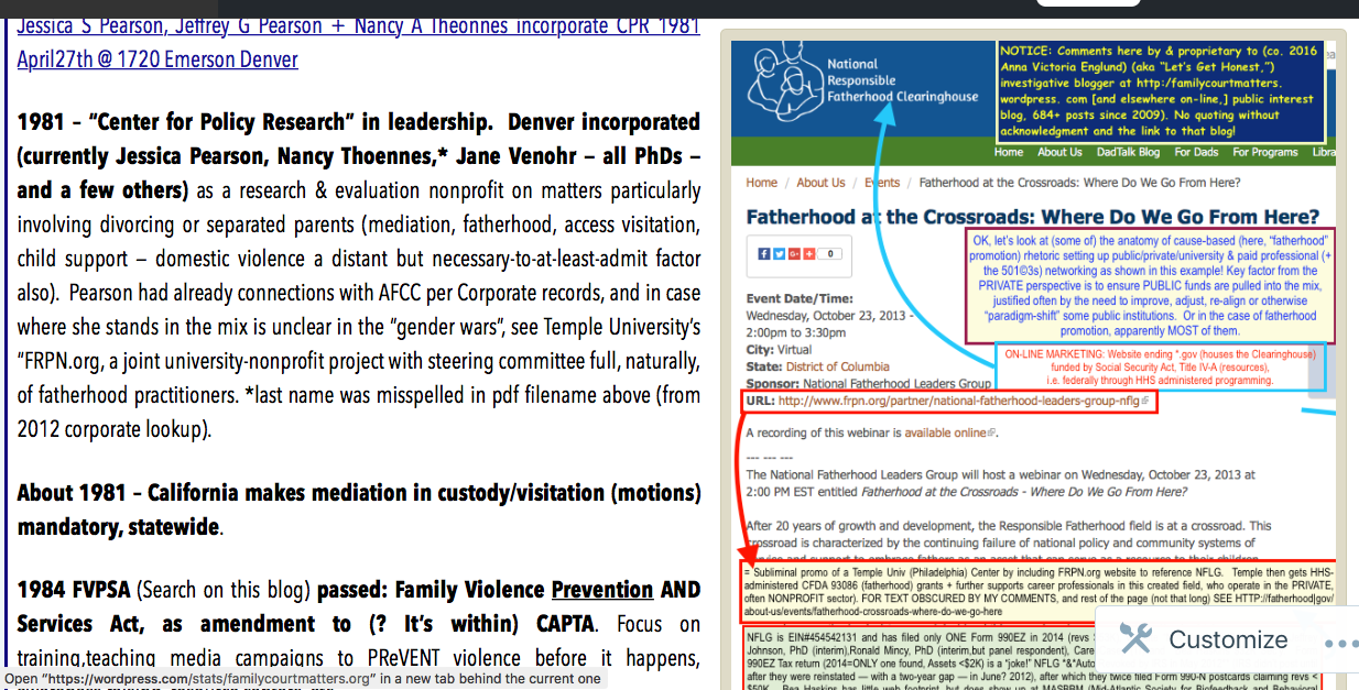 FamilyCourtMatters phrase search FRPN.org ~>LEFT: top: Link to pdf of original CPR incorporation (obtained by me in Dec. 2012 from State of Colorado business entities search) and some descriptive text. RIGHT: my annotated detail from Fatherhood.gov (see original site for better view: this is an “image of an image” and harder to read) showing FRPN connections. Image is #2 of 2 from my 3/28/2018 page, in its Footnote AFCC (and the USA) by the Decades| search conducted 4/23/2018
