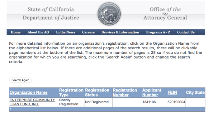 Search results from “Verification Page.” I’m looking at the Enterprise Community Partners / Living Cities: National Community Development Initiative (DE corp with NY entity), Low Income Investment Fund (in SF), “LISC” (Local Initiatives Support Corporation) appropriating (with help from HUD, obviously) the Community Development Field. (This search result is an ECP related entity — in 2007, 2008 it was the only one. Now there are many) which these “search results” say is not registered with the trust in California, although I see from the corresponding SOS registration in California, it’s been here for many years. Notice now these search results show an EIN# — they didn’t use to. The data here only goes back typically to about 2000 BUT plenty of nonprofits go back much further…