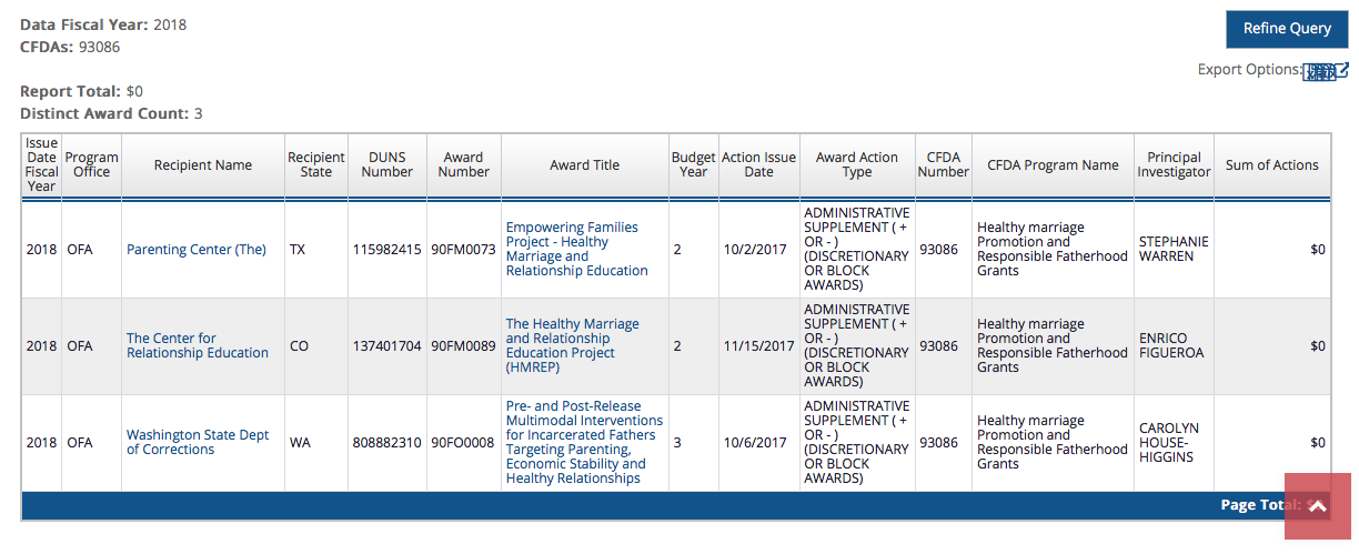 TX result (The Parenting Center, 2928 W. 5th Street FORT WORTH, TX 76107) shows (only) Grant 90FM0031 (2011-2014, from about $700K – $800K/year with $181K “adjustment” (decrease) in FY2015, but addition of larger ($1.38M) similarly title 90FM0071 shown above. The organization name sounds familiar to one I found associated with Rule 34 (court-ordered parenting curriculum) by, if involving Spanish-speaking or Out-of-State parents, an OH-legal domicile but OR or WA-based “Center for Divorce Education” run by Arbuthnot & Gordon (absolute AFCC connections), with “funky filing” 501©3s. The TX group was tracked through one of its testimonials. If I confirm same group, will post it (cannot explain in a single image caption…).