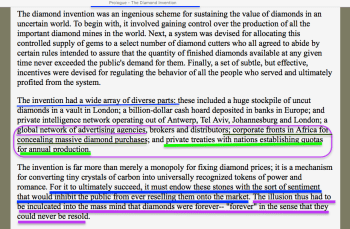 A lot of this (and my general interest), again, tracking back something as basic as the Rhodes Scholarships, relates to colonization of South Africa and the former “German Southwest Africa” surrounding the discovery of diamond mines in 1870, as described in a book published in the 1980s by Edward Jay Epstein (searchable also on this blog), with implications when it comes to cartels and vertical control of international trade. Prologue: The Diamond Invention This is well-written and clear. (Oppenheimer, De Beers, an (Chapter 1) Namibia as a diamond-producing territory. Oppenheimer not worried — any government would need the tax revenues on diamonds, what’s more, what easier product to smuggle? (the whole book is on-line, read in context)… Here are a few images from that book. It’s informative also on how such cartels can be (and are) created; diamonds is just one example: