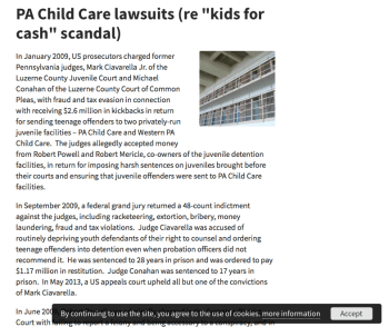 2009 – “Kids for Cash” scandal (indictments, class action lawsuits, etc.) in Luzerne County Pennsylvania. Summarized at “Business & Human Rights Resource Centre” under ‘PA Child Care lawsuits (re: “kids for cash” scandal).