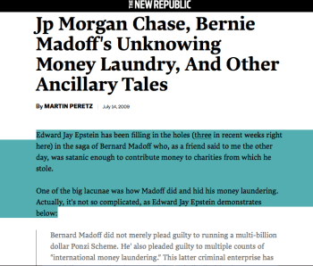 In the image, notice the awkward title (how can laundry “know” anything? Bernie Madoff certainly wasn’t “unknowing”as he pled guilty to it, so who else — in the title — was then “unknowing”? Only JP Morgan Chase, which implies JP Morgan Chase was not in on it. Although this isn’t stated directly. Source of the New Republic quote under a simpler title seems to also be from Epstein’s weblog, July 2009, and called Madoff’s Incredible Money Laundry; neither title or content makes any reference to JP Morgan Chase knowing or not knowing..