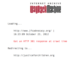 JFCAdvocacy.org Calendar bargraph (years it was “crawled” and snapshots taken; from the InternetArchive.org “(=WaybackMachine) on any highlit year a 12-month calendar displays; dates pictures were taken of the website can be clicked on. That’s how I got the “redirect message nearby.