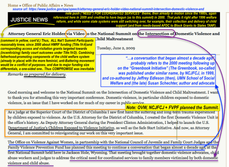 Later, obviously (between 2009 – 2016, see “Obama Administration”) the US Attorney General Eric Holder has addressed the situation of “Children Exposed to Violence” at one or the other of these conferences, in 2009: National Summit involving FVPF and NCJFCJ, and characterized as “almost a decade ago” when the first summit started. His statements (with video also) as posted at the USDOJ. (heavily annotated image placed below, as it happened after the 2007 conferences next bullet talks about).