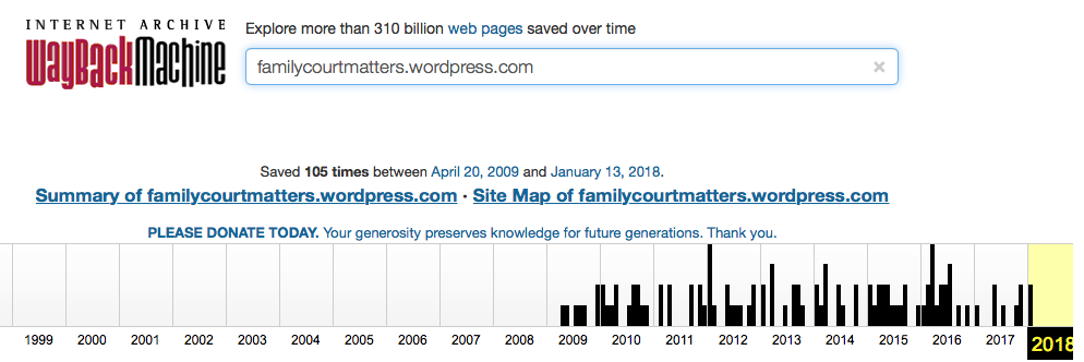WayBack Machine Bar Graphs of their Image Captures over time, FamilyCourtMatters’org (shorter graph) and —Wordpress.com inclusive, taken 2018Jan27