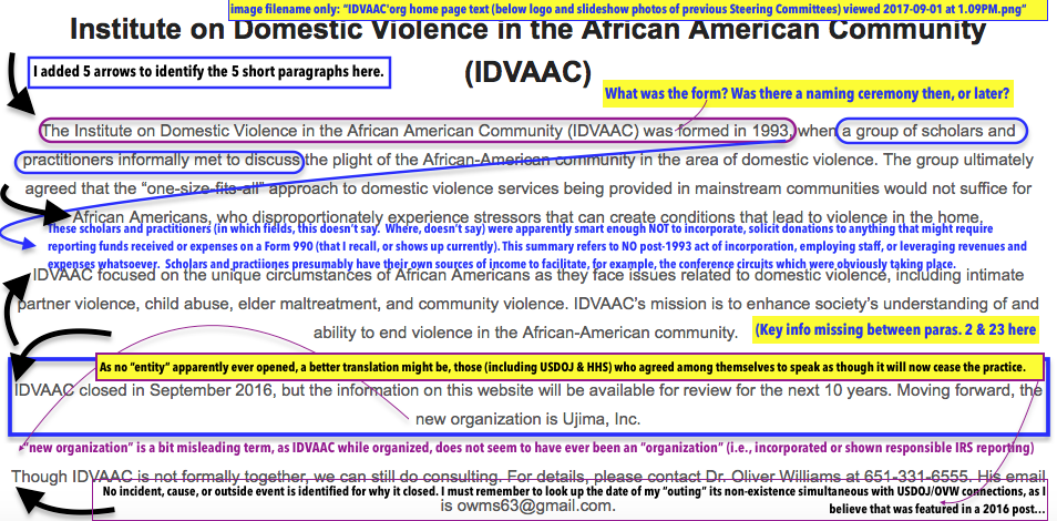 From IDVAAC.org, home page main text (w/ major annotations about its non-registration, or admission to ever having been one, 1993-2016. Below this website links to past projects but this is the main content area text, Viewed 9/1/2017. (click image to enlarge)