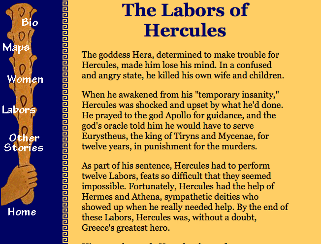 Click image to read the story. If you don’t like the simplification, complain to Tufts University, where I found it posted. Notice this begins with blaming a goddess for Hercules’ tempporary insantiy resulting in familicide (murder of his wife and children), and his forced labor as punishment.