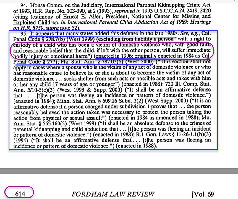 If Parental Kidnapping (Domestic or International) is ALWAYS Child Abuse, Where do the UN CRC and Hague Convention fit in? Obstructing the Escape from Domestic Violence, even within the USA? (D. Huntington then ℅ AFCC-related* Center for the Family In Transition, M.W. Agopian, N. Faulkner (1999), Merle H. Weiner (2000, Fordham) etc. [Written, Stayed “Pending” Jan. 2018, Released/Published only Sept. 2019]. » Escape from DV** FordhamLawReview (2000 Vol69, p593ff) (re Hague Conventn, CRC, Changing Stereotypes + US Laws re Parental Abductn | cites Agopian) ~2018Jan17 Wed @8.41.47 PM 00017