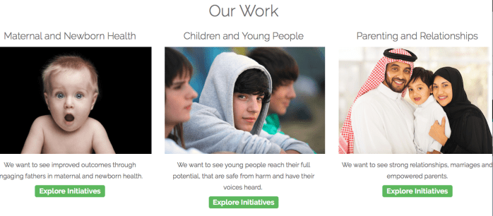 Image 2 of 3, Family Initiative (UK) Home page, Middle, “Our Work” (note RH image, incl woman with burqa.