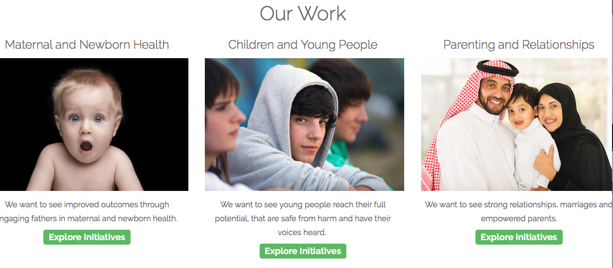 Image 2 of 3, Family Initiative (UK) Home page, Middle, “Our Work” (note RH image, incl woman with burqa.