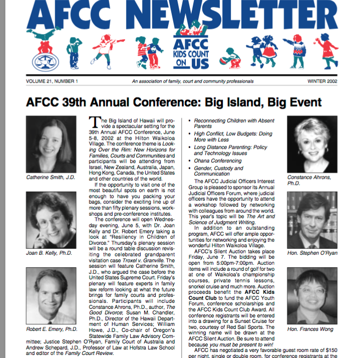Cover page of a 2002 AFCC newsletter, Vol. 21, worth browsing (notice people referenced in thumbnails).