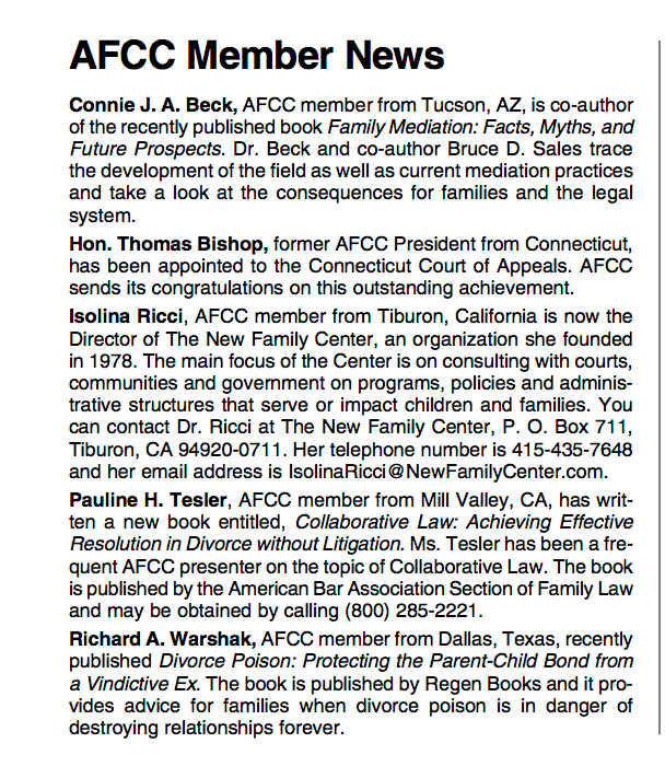 AFCC member news 2002 includes Pauline Tesler, Isolini Ricci in association with her nonprofit (at some point she was also working for Calif. Judicial Council/AOC), Warshak, and others.