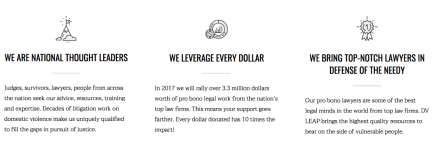 - Image display/navigation: These are presented, with captions previously written, as an image gallery displaying as circles. I’m somewhat new to the function, which you can tell in part by how many I incorporated into the home page! Click on any one to start and move to the next one by clicking on the image. I will discuss the “analysis” and logic (sic) part of the image’s, and approach this represents separately as well as how DV LEAP’s “helpful” of “DV Organizations/National Resources” under the rather grand title, “Legal Resource Library” for referrals (as they cannot take most cases, vet cases for which ones to take, and are still so small an outfit) — of which several are dead ends, defunct, and expired links. As you can see (though in light print, small size) the motto now is “Making the Law Work for Survivors of Domestic Violence.”