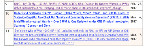 As to Statewide Coalitions, their names vary but can be found following that funding (from TAGGS.HHS.gov/SearchAdv) by specific “CFDA#s” (*note; the CFDA system now called something else: “Assistance” but the CFDA numbers have been preserved, it seems). Think in terms of rivers flowing and dividing into their tributaries, i.e., recipients). Once identified not by name or posted lists only (which evolve or change) but by who’s getting the annual “SADV” funds), then each of these have “members” which must (I learned recently, spelled out in one state’s tax returns) tow the line of the state board, or forget (presumably) pass-through funding. It preserves policy and unity — and right now, that policy and unity includes NOT informing mothers and clientele (1) how the system is organized or (2) the extent, scope, operations, or even EXISTENCE of 1996 PRWORA (and subsequent re-authorizations) of the Social Security Act and federal Budget) Welfare-Reform- based (among others) so-called “fathers’ rights” (really, it’s “Healthy Marriage/Responsible Fatherhood” grants and programs.
