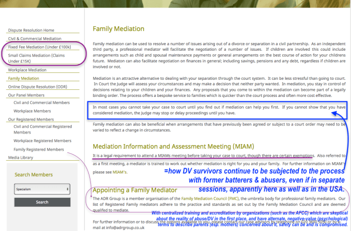 Consolidated Control of DV Advocacy by Feminist Leadership Refusing to Identify, by Name and Financing, The Opposition Entities. Subtitle: Personal Relevance to a Post-DV-Intervention, Unprosecuted, Child-Stealing Event by Ex-Batterer case in the SF Bay Area. [a PAGE, Publ. Feb. 2, 2018] » 02-ADRg (UK) ~> Family Mediation, mandatory MIAMs + ~**~~>>ADR Group is a member of the FMC<<~**~ SShot Shot 2018-02-01 at 2.22PM