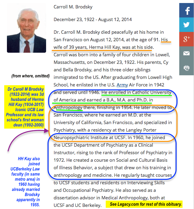 Dr Caroll M Brodsky (1922-2014) was 3d husband of Herma Hill Kay (1934-2017) Iconic UCB Professor,Read More@Legacy.com obituary. **MY COMMENT about her year of marriage ERROR (image bottom left, in blue): My math was off: 2014-39 = 1975, not 1955!!)