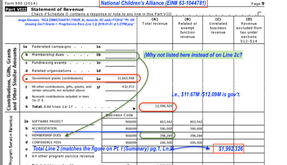 NCA EIN#631044781 (1992ff, AL domicile, DC addr) FY2014 **Pt. VIII showing Gov’t Grants + ProgrService Revs (Lns 1,2)