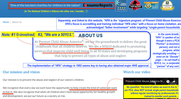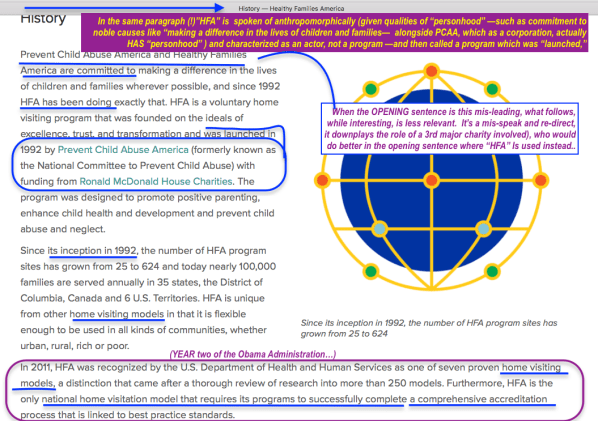 Linguistic anomalies abound when PCAA attempts to characterize its own signature program, to this day… Classic transformational grammar helps start out (mis)characterizing HFA as a “Partner/Actor/Doer/Feeler” [which it isn’t…] then deftly switch to admitting it’s actually a “program” launched — all within one paragraph — and in the fine print (following paragraphs) HFA is now a “national program model” for home visitation, complete with an accreditation requirements and the blessing of the United States HHS in 2011… Readers are thus encouraged to believe that both are simultaneously true, i.e., engage in some serious “poetic license” and then “Donate” — with its own donate page not even identifying any payee..