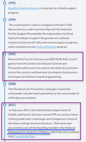 This “PCAA” About Page image is followed by timeline (in two sections), and then descriptions from “HFA” (HealthyFamiliesAmerica.org) website revealing more about the nature of PCAA’s core program — home visitation, control of accreditation, and the timing of CDC & HHS approvals of PCAA, who finally changed its name to this in 1999…