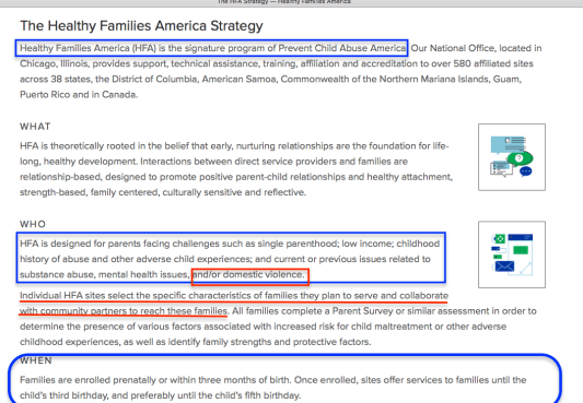 Timeline at “PreventChildAbuse.org” makes it clear that a 1992ff change (about the time National Children’s Alliance was formed, per its Form 990s), with help from Ronald McDonald House Charities, the “Healthy Families America” program (not nonprofit, but “program”) model focusing on home visitations sprang into action. Targeting single-parent, low-income, or previously abused households, or those with “domestic violence,” it recommends once a week home visitation in a child’s first six months, and continuing thereafter until about age five.