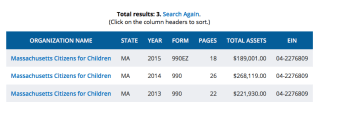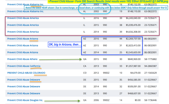 Form 990 (“990finder”) search results for “Prevent Child Abuse” entities. Click to enlarge, or repeat the name search for more results)….