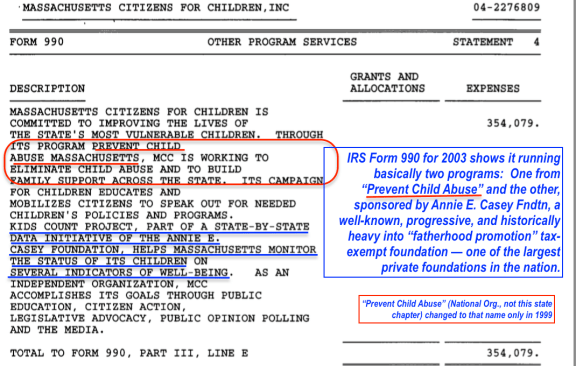 [Double-checking that statement, without posting all the evidence, “Massachusetts Citizens for Children, Inc.” aka apparently “MassKids” — which is the official “PCA chapter for Massachusetts since 1986, per its website — claimed Eli Newberger, M.D. as “Advisory Board” and “President Emeritus” on a FY2003 tax return list.