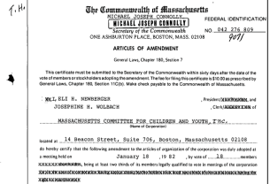 Articles of Amendment, 1982 for what is now “MassKids” (Mass. Citizens for Children, Inc.). notice the President.