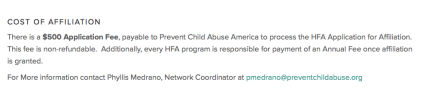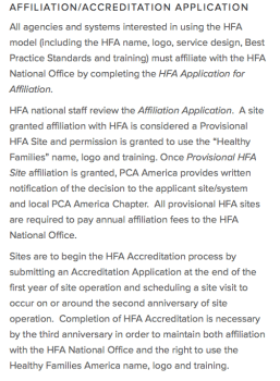 Back on the “HealthyFamiliesAmerica.org” website we can learn more about the costs and process of “affiliation” with this program model ($500 non-refundable application fee, payable to Prevent Child Abuse America, with continuing annual fees, size not specified here…). Once a (site? organization?) is committed to the tune of ½ thousand $$, then others can move in with the technical assistance and training how to implement….
