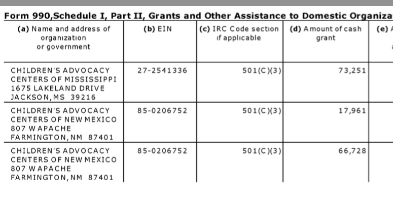 For example, National Children’s Alliance, Alabama-based (legal domicile) and its network of CACs and Statewide CAC Coalitions (FY2014 Grantees) [Published Jan. 2, 2018]. » 14 NCA EIN#631044781 (1992ff) FY2014 SCHED I GRANTEES (presented 3-UP by 990-filer, Arrggh!)~ Viewed 2018Jan02Tue @12.18.36 PM