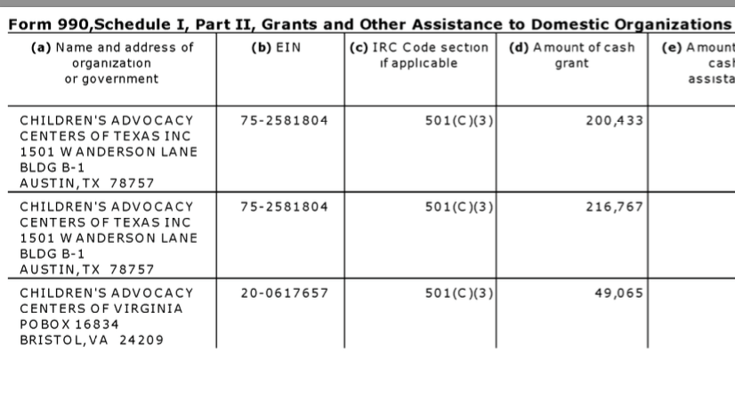 For example, National Children’s Alliance, Alabama-based (legal domicile) and its network of CACs and Statewide CAC Coalitions (FY2014 Grantees) [Published Jan. 2, 2018]. » 16 NCA EIN#631044781 (1992ff) FY2014 SCHED I GRANTEES (presented 3-UP by 990-filer, Arrggh!)~ Viewed 2018Jan02Tue @12.19.20 PM
