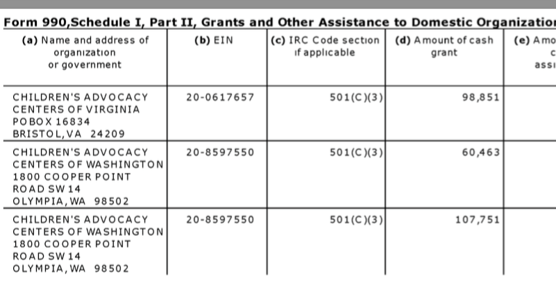 For example, National Children’s Alliance, Alabama-based (legal domicile) and its network of CACs and Statewide CAC Coalitions (FY2014 Grantees) [Published Jan. 2, 2018]. » 17 NCA EIN#631044781 (1992ff) FY2014 SCHED I GRANTEES (presented 3-UP by 990-filer, Arrggh!)~ Viewed 2018Jan02Tue @12.19.31 PM