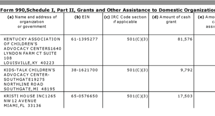 For example, National Children’s Alliance, Alabama-based (legal domicile) and its network of CACs and Statewide CAC Coalitions (FY2014 Grantees) [Published Jan. 2, 2018]. » 27 NCA EIN#631044781 (1992ff) FY2014 SCHED I GRANTEES (presented 3-UP by 990-filer, Arrggh!)~ Viewed 2018Jan02Tue @12.21.56 PM